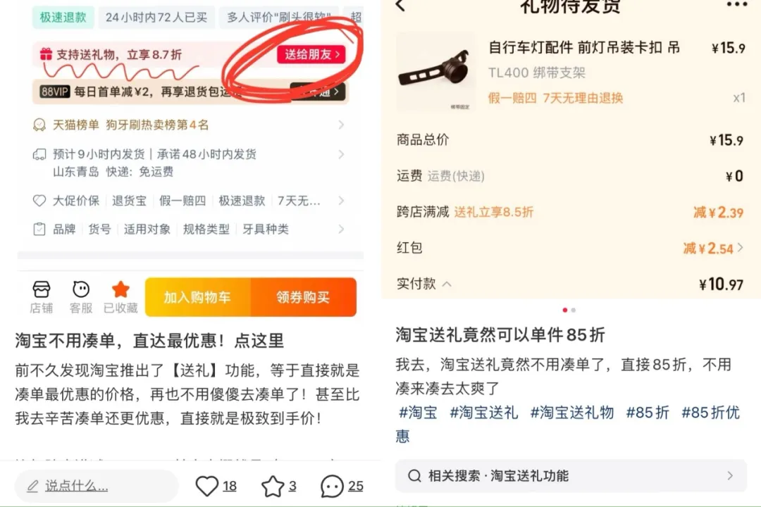 由于淘宝的许多商品支持“送礼物,立享8.7折”,所以不少消费者用自己的大号下单,送给小号,相当于自己以折扣价买给自己。也有网友提到,“可以发给好友,让他填你的地址。”在微博、小红书等社交媒体,不少与“淘宝送礼物”相关的笔记都与“薅羊毛”挂钩,其中有标题为“不用凑满减了”的笔记称,“新出的这个送礼功能,直接无痛八五折,现在改成九折了,但依然很适合只有一件想买的,不用费心凑满减了……我直接填自己地址,大小号互相送。”