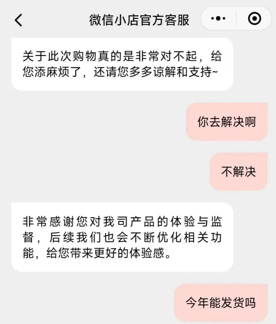 但让鱼鱼没想到的是,这场送礼变成了给自己添堵。他在社交媒体上发帖称,“详情页写的48小时发货,结果拖到现在已经6天了,找商家没有任何结果,问不出能发货的时间,直接关闭对话,再问就是‘你去退款呗’而送礼物退款是收礼方才能退,让我去找收礼方操作退款。微信小店官方客服更是解决不了问题,大家一定避雷。”