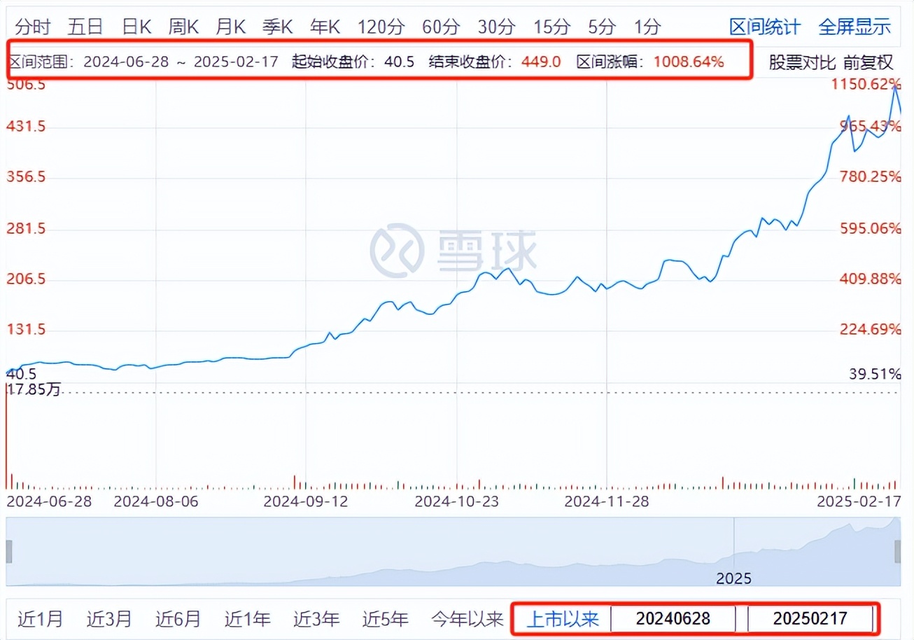 这一点折射到强调“预期”的投资市场,老铺黄金估值一路飙升。截至2025年2月17日收盘,老铺黄金股价达到449.0港元,自上市以来增长超十倍,港股市值达到425.54亿港元。