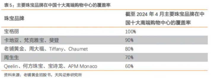 从线下渠道看,老铺黄金于国内仍有潜在增长空间。据天风证券分析师测算,二线及以上城市中,我国年销售额30亿以上合计109家,假设老铺开80%左右,对应大约90家,相较目前有翻2倍空间。同时,参考宝格丽、卡地亚、梵克雅宝在我国二线及以上城市的门店数量,老铺开店门店数相较目前有翻1倍空间。