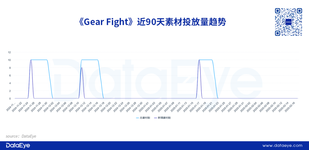 DataEye-ADX海外版数据显示,《Gear Fight》在去年11月24日就进行了测试素材投放,至今一共测试了三次,整体力度也不算大。而在第三次测试之后(1月23日)就基本停止了买量投放,这或许是游戏产品在测试阶段已经收集到足够的数据,为下一轮投放进行准备、调整。