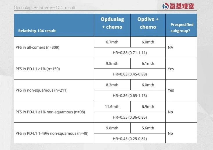 在2期临床RELATIVITY-104中,Opdualag联合疗法组的结果并不如意,ORR和中位PFS分别为51%和 6.7 个月,而仅使用Opdivo和化疗组的数据分别为44%和6个月,这两个结果在统计学上都没有说服力。