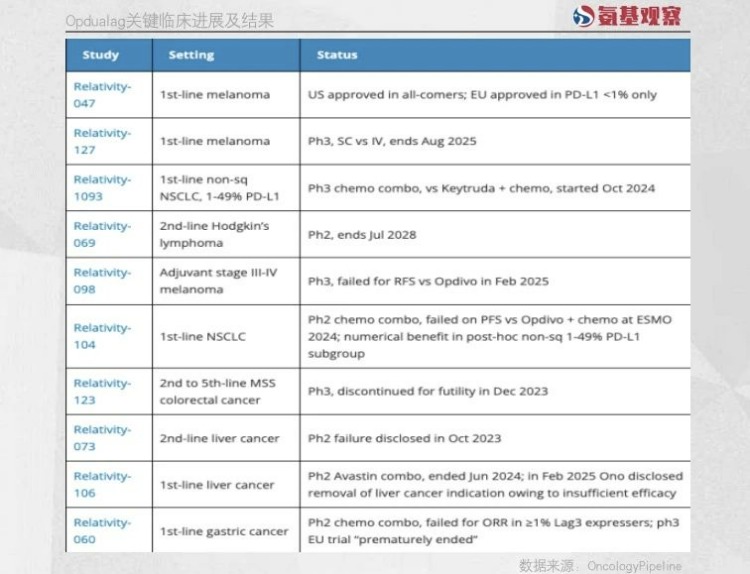 至今为止,Opdualag在一线胃癌、一线肝癌、二线肝癌、2至5线MSS结直肠癌、辅助III-IV 期黑色素瘤的关键临床中,相继失利。