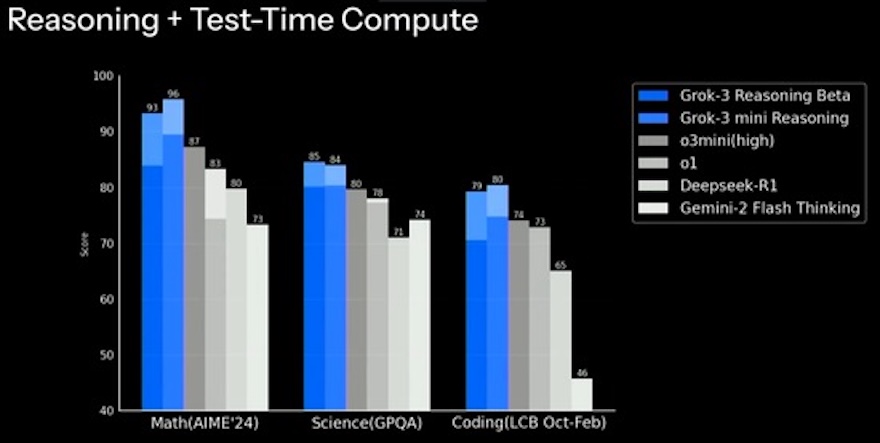 此外,在推理能力和测试时计算能力上,Grok 3和Grok 3 mini也能超越o3 mini(high)、o1、DeepSeek R1、Gemini-2 Flash Thinking。