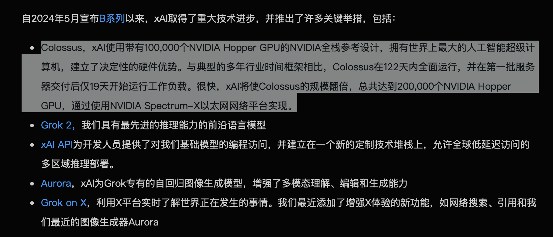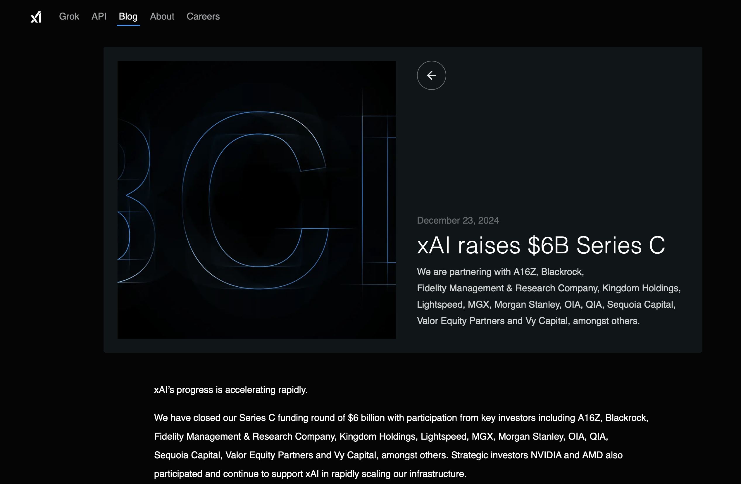 官网信息显示,xAI已经结束了60亿美元的C轮融资,主要投资者包括A16Z、Blackrock、Kingdom Holdings、Lightspeed、MGX等。战略投资者英伟达和AMD,也参与并继续支持xAI快速扩展其基础设施。