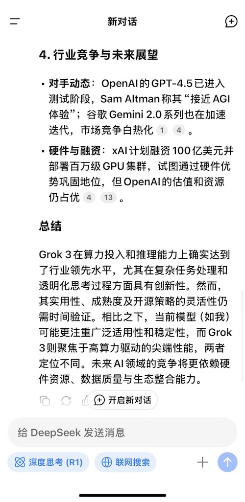 对此,DeepSeek在总结部分称,“Grok 3在算力投入和推理能力上确实达到了行业领先水平,尤其在复杂任务处理和透明化思考过程方面具有创新性。然而,其实用性、成熟度及开源策略的灵活性仍需时间验证。相比之下,当前模型(如我)可能更注重广泛适用性和稳定性,而Grok 3则聚焦于高算力驱动的尖端性能,两者定位不同。未来AI领域的竞争将更依赖硬件资源、数据质量与生态整合能力。”