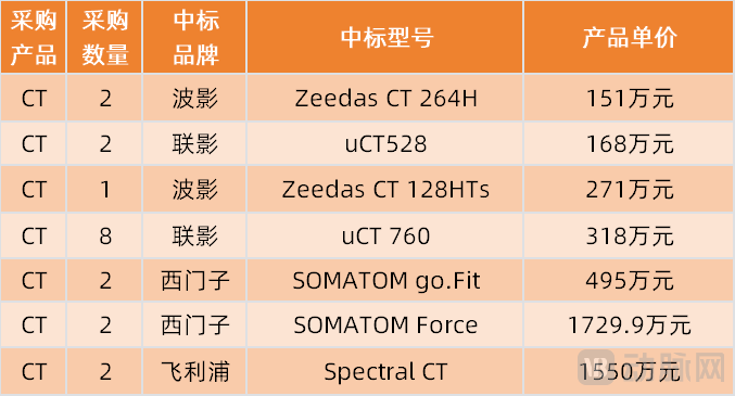 再如,在苏州市2024年公立医疗机构第一批医疗设备集中采购CT项目中,联影医疗中标10套,西门子医疗中标4套(2套中高端、2套超高端),波影中标3套,飞利浦中标2套(超高端)。