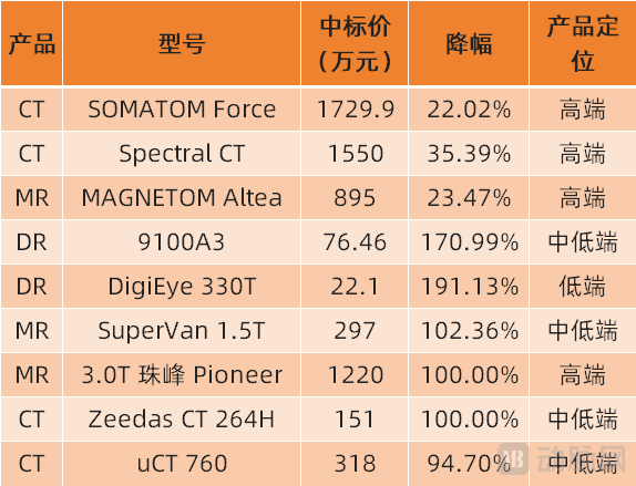 另外,在近期公开的北京大学第一医院医疗设备更新项目中,GE医疗中标一套超高端3.0T磁共振设备,中标价2200万;一套超高端多排螺旋CT,中标价2000万;一套高端1.5T磁共振,中标价1200万。西门子医疗中标一套超高端3.0T磁共振,中标价2180万。
