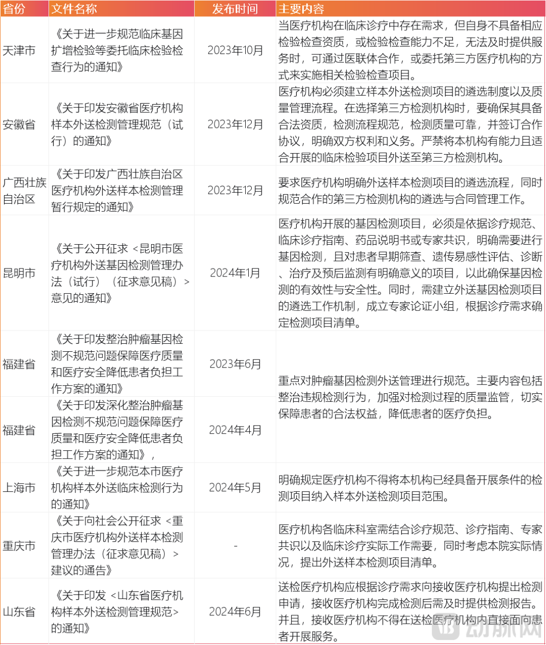 2023年以来,各省市更密集发布规范临床样本外送的规则。不过,细看各省市发布的相关文件,关于样本外送的监管导向,已经从早期认为的全然禁止,向规范管理转变。比如,安徽省和上海市都提到,医疗机构不得将本机构已经具备开展条件的检测项目纳入样本外送检测项目范围。重庆市要求考虑本院实际情况,提出外送样本检测项目清单,广西壮族自治区则明确提出,要求医疗机构明确外送样本检测项目的遴选流程,同时规范合作的第三方检测机构的遴选与合同管理工作。