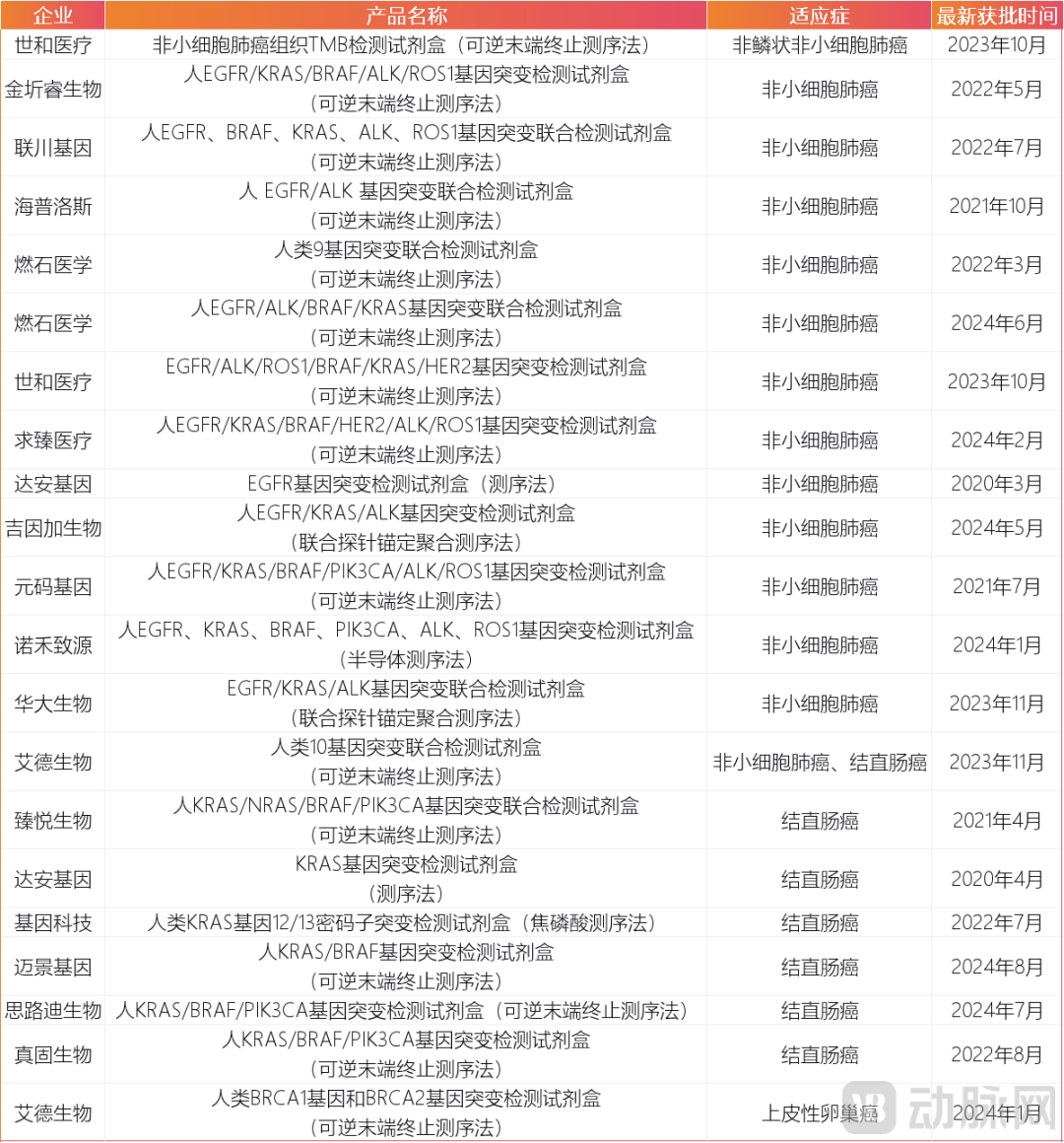 2018年7月,燃石医学的“人EGFR/ALK/BRAF/KRAS基因突变联合检测试剂盒(可逆末端终止测序法)”获批上市, 成为国内首个基于高通量测序技术以及伴随诊断标准审批的多基因肿瘤突变联合检测试剂盒。此后,超过20个肿瘤NGS检测试剂盒拿下医疗器械III类注册证,为非小细胞肺癌、结直肠癌等高发肿瘤患者筛选合适的靶向药,提供有效工具。