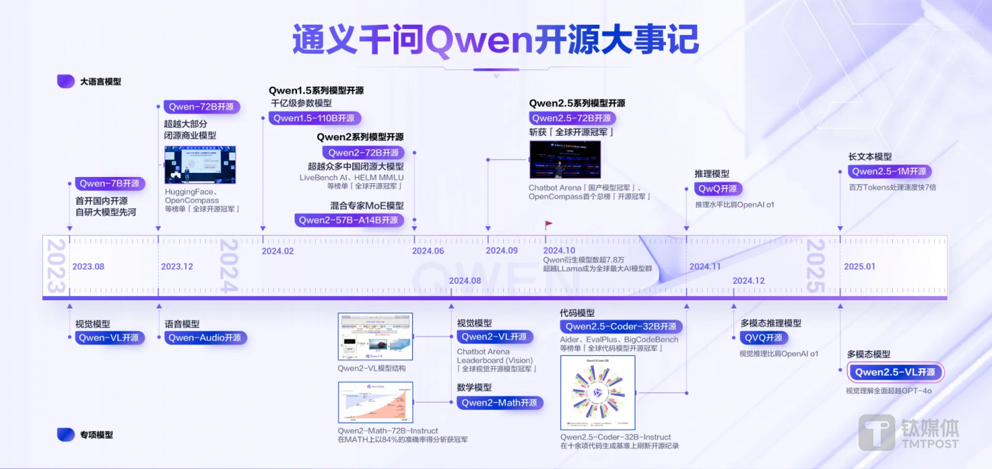 2025年1月,阿里巴巴开源了新一代多模态模型Qwen2.5-VL推出基于MoE架构的旗舰模型Qwen2.5-Max,两个模型在公认的基准测试中全球领先。