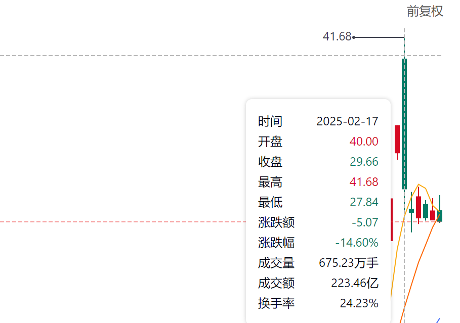 2月17日,光线传媒股价开盘后一度冲高至41.68元 ,市值超过1000亿。但随后便一路震荡下行,盘中一度触及跌停,最低跌至27.78元 ,最终收跌14.6%,报收 29.66元 ,成交额高达 223.46 亿元,创历史新高。