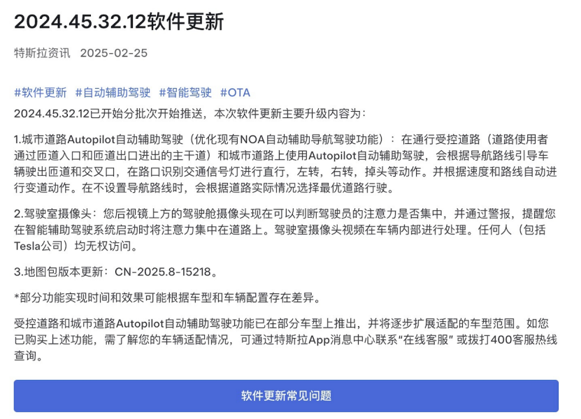 2月25日,国内有特斯拉车主发现,自己的APP上出现了2024.45.32.12版本软件更新,主要升级内容为:城市道路Autopilot自动辅助驾驶(优化现有NOA自动辅助导航驾驶功能)、驾驶室摄像头、地图包版本更新。