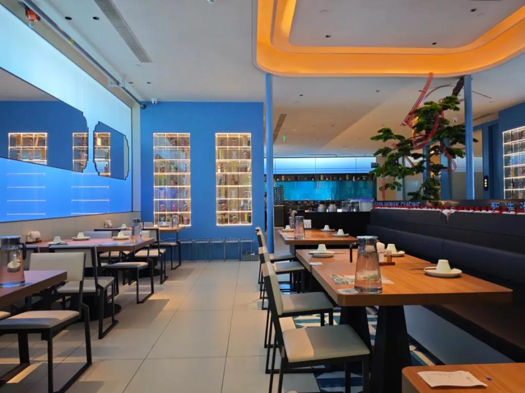 从店型和装修来看,诸如魏北道、魏客、湘魏兒等品牌,投入并不少,整体环境装修较精致,门店面积也不小。以湘魏兒为例,门店选址在购物中心,整体装修精致,融入了绒花、灯笼等传统文化元素,还有专门的食材、酒类展示柜。