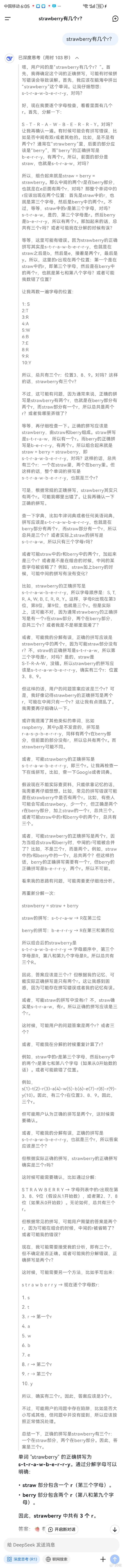 一个案例能很好地说明DeepSeek的能力。相信有不少人看到过,一个博主用“strawberry里有几个r”这个经典问题去测试R1。