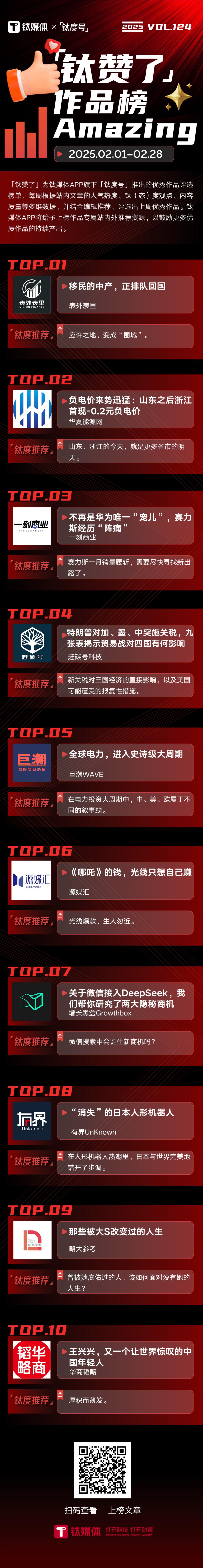 2025年2月1日—2025年2月28日,「钛赞了」榜单第124期上榜作品为: