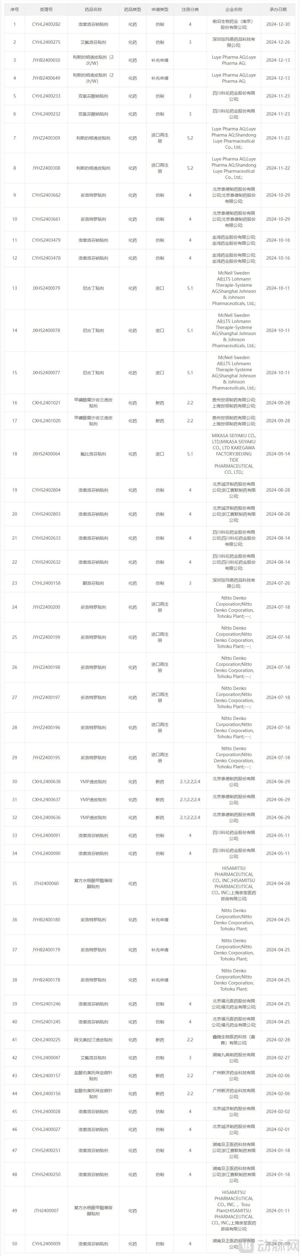 据NMPA的数据,截至2025年3月6日,已有17款透皮贴剂提交上市受理申请,而2022年全年也仅有22款产品。值得注意的是,2024年全年有51款产品提交申请,可见的将来市场会有巨大的变动。
