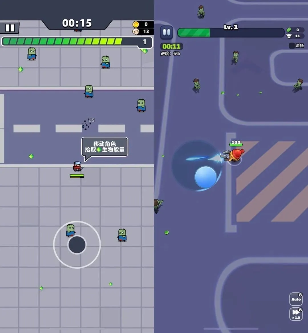 《文明霸业》(《Eyony》)、《Puzzles & Survival》、《菇勇者传说》、《向僵尸开炮》:以跑酷+射击+数字叠加类素材为主;