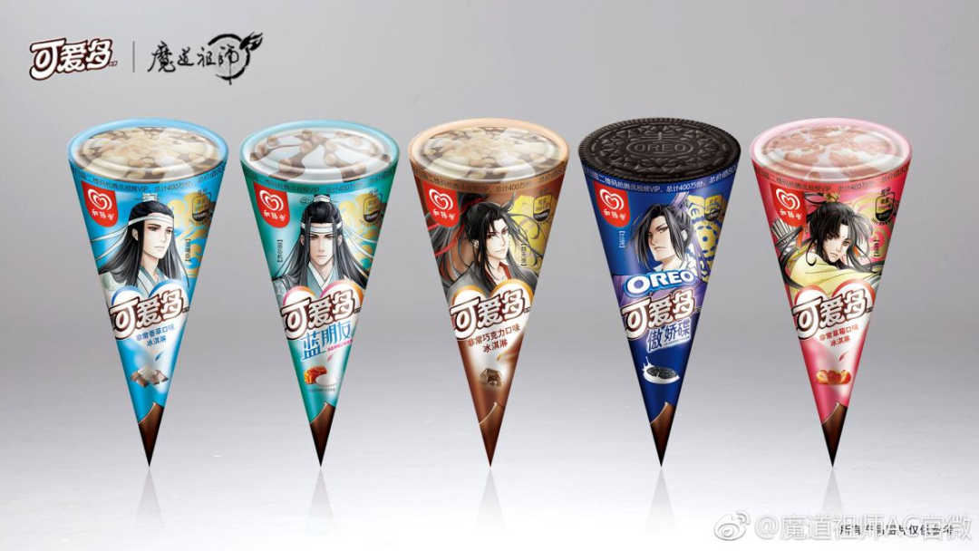 2018年,可爱多冰淇淋选择跟热门动漫IP《魔道祖师》联名,不仅有中插广告、软广植入,还邀请片中的五位男性角色作为代言人,研发出了五种包装口味各不相同的冰淇淋,依托《魔道祖师》IP影响力,可爱多X《魔道祖师》合作微博发布后一个小时内转发破万,短短一个月内收获超过1800万话题关注。