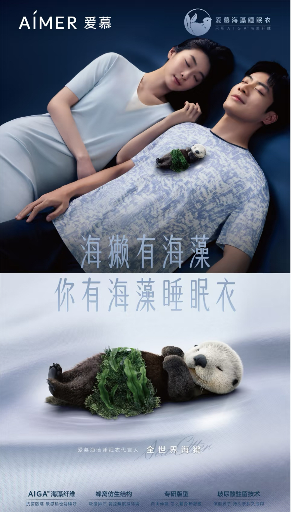 海獭是海洋界的“睡眠质量担当”,日均睡眠超14个小时,它们借助海藻调节体温、稳定睡眠环境,这一特性成为爱慕研发海藻睡眠衣的灵感来源。这次营销以“海獭有海藻,你有海藻睡眠衣”为口号,通过广告片呈现海獭与人类睡眠场景的强关联,既传递产品功能,又以萌态戳中当代人睡眠焦虑。