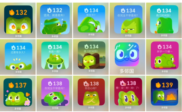 多邻国的小绿鸟“多儿”勉强能跟雪王平分秋色。为了让用户学习,它化身表情包,卖萌、卖惨、鼓励、恳求……无所不用其极;它到处蹭热点,不管姿势好不好看,能刷存在感就对了;它不惜假死以身入局,道德绑架用户累计学习经验值将自己复活……虽然又疯又癫,但多儿真的很敬业是不是!