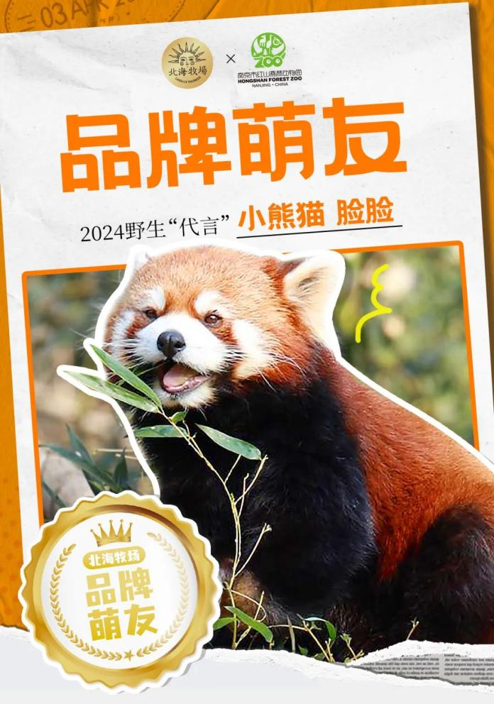 2024年初,北海牧场和南京市红山森林动物园动物搞起了动物选秀,经过为期一个月的紧张选拔,北海牧场最终官宣小熊猫“脸脸”为品牌的野生代言人。脸脸不负“品牌萌友”的称号,果真萌人一脸!