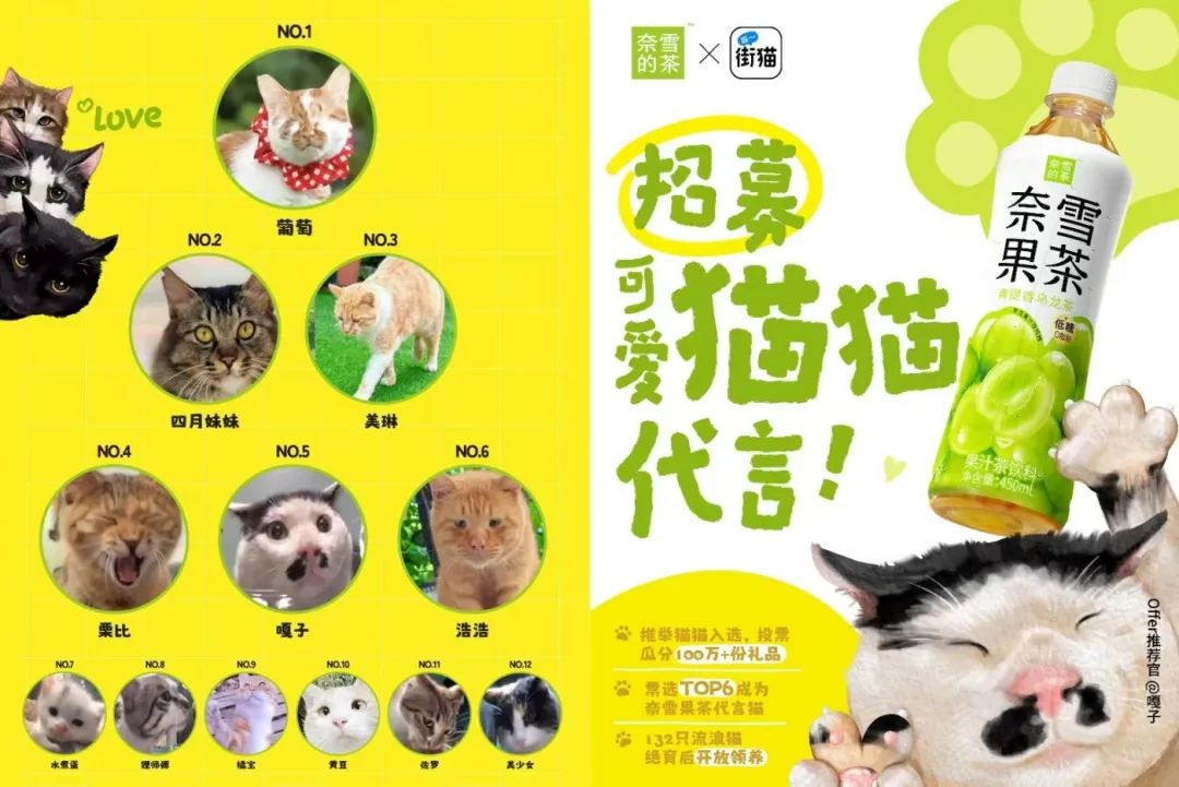 也有品牌会把动物代言与公益挂钩。比如2024年,奈雪的茶和救助平台街猫合作,在流浪猫中招募品牌果茶代言,号召大家在街猫送自己心仪的猫猫成团出道,助力绝育和领养,从而影响更多的人关爱和领养小流浪。