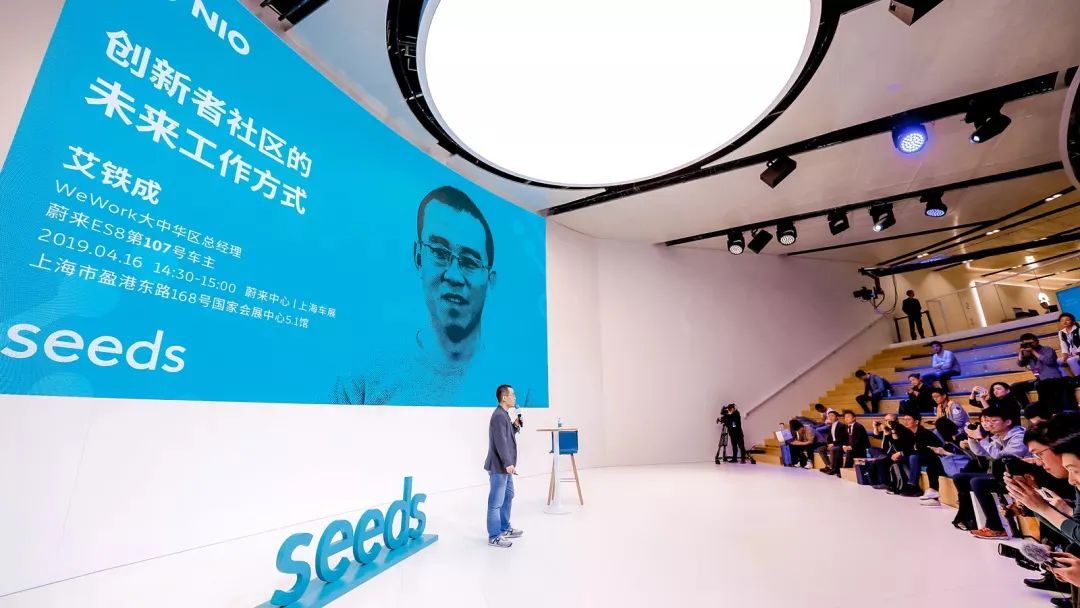 2019年,还只是蔚来车主的艾铁成在蔚来上海车展的seeds讲台上,图/蔚来官微