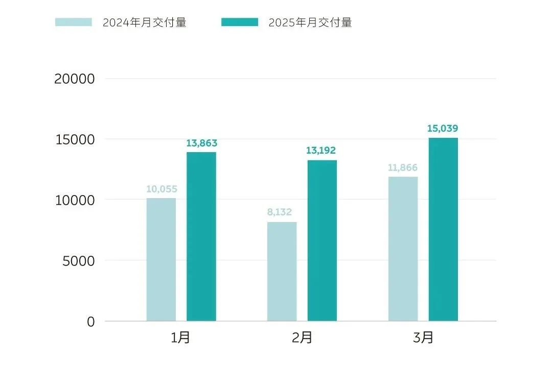 3月份,蔚来一共“只”交付了15039台车。对比之下,零跑、理想、小鹏的交付量都超过了3万辆,小米也卖出了接近3万辆。