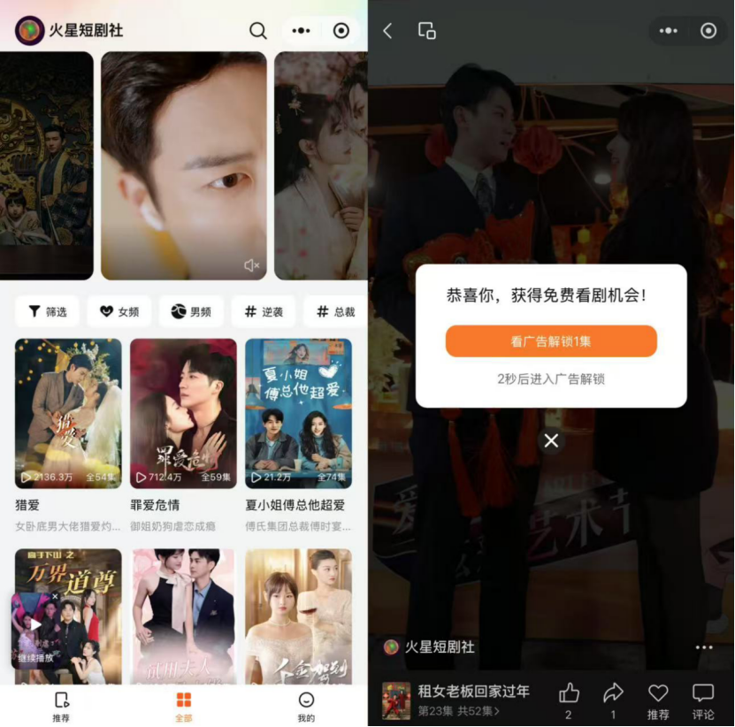 为进一步切入免费短剧市场,腾讯视频近期在微信上线了“火星短剧社”短剧小程序。内容为竖屏播放形式,采用的是广告解锁模式,由腾讯视频及合作方提供。也就是说,腾讯视频的付费短剧和会员短剧可以在“火星短剧社”小程序上免费观看。