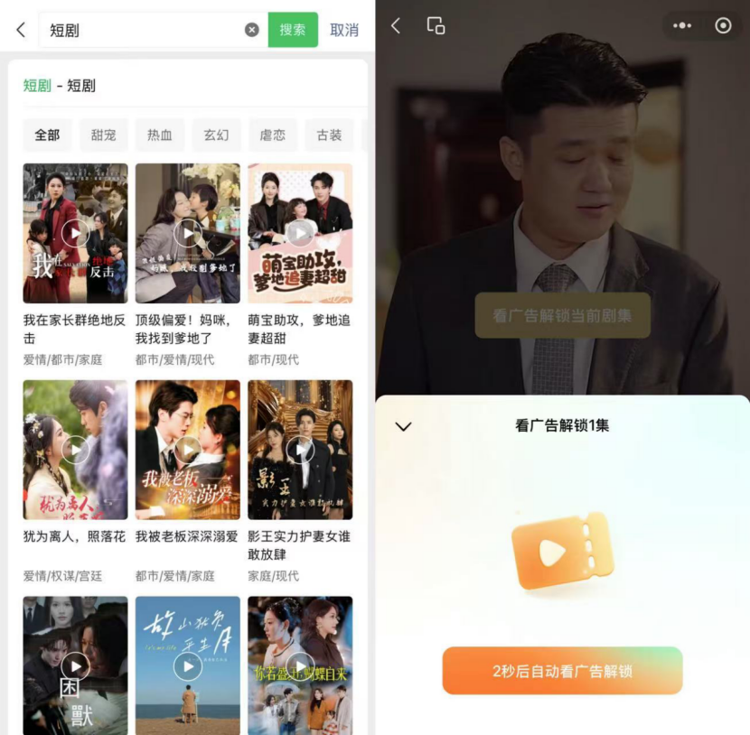 去年2月,微信上线短剧专区,聚合第三方短剧小程序,该专区短剧采用的是IAA(应用内广告模式)模式,用户需要看广告解锁剧集。同年7月,微信推出IAA免费短剧推广计划,鼓励开发者将免费观看的微短剧纳入推广计划。