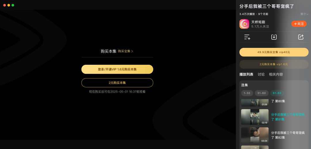 譬如短剧《分手后我被三个哥哥宠疯了》,在腾讯视频上解锁每集需要花费1.6元;但是该剧已经上线“火星短剧社”小程序,用户只需看广告即可解锁下一集。