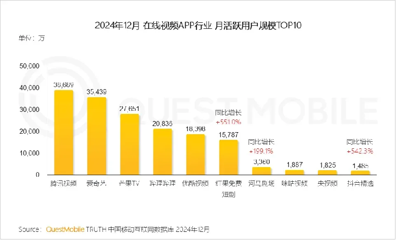 QuestMobile数据显示,去年12月,红果短剧的月活达到1.58亿,仅比优酷月活少了不足3000万。今年1月,红果短剧月活增长至1.66亿。