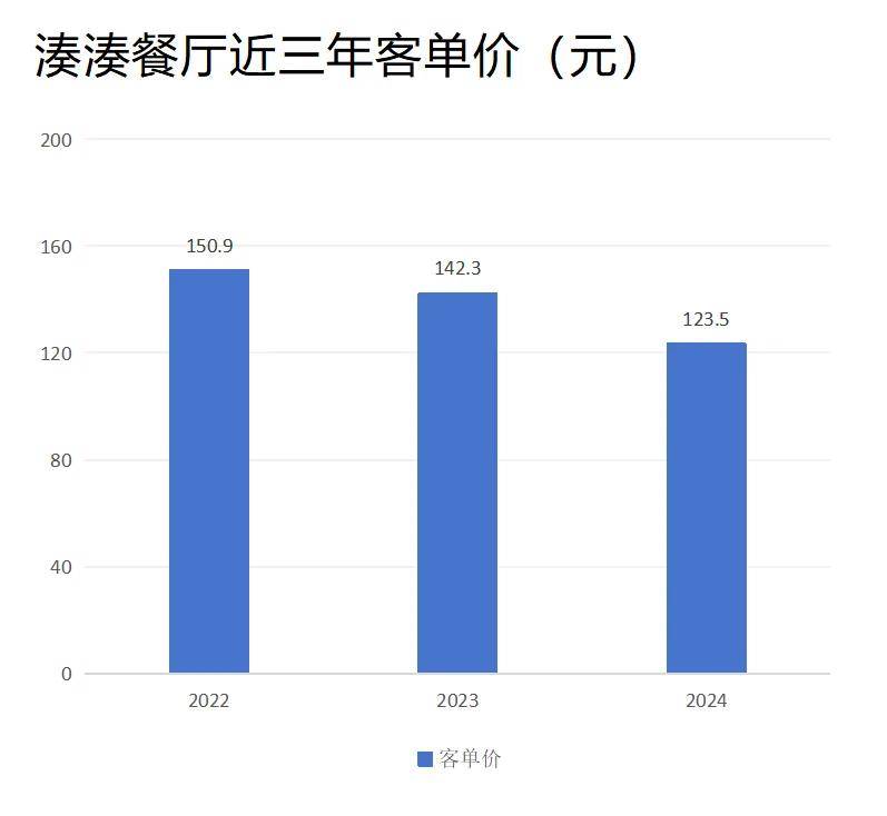 其定位高端的湊湊餐厅也跟随降价策略,推出小份菜,将客单价从2022年的150元拉低至2023、2024年的142.3元、123.5元,一连降了三年,幅度一年比一年大。