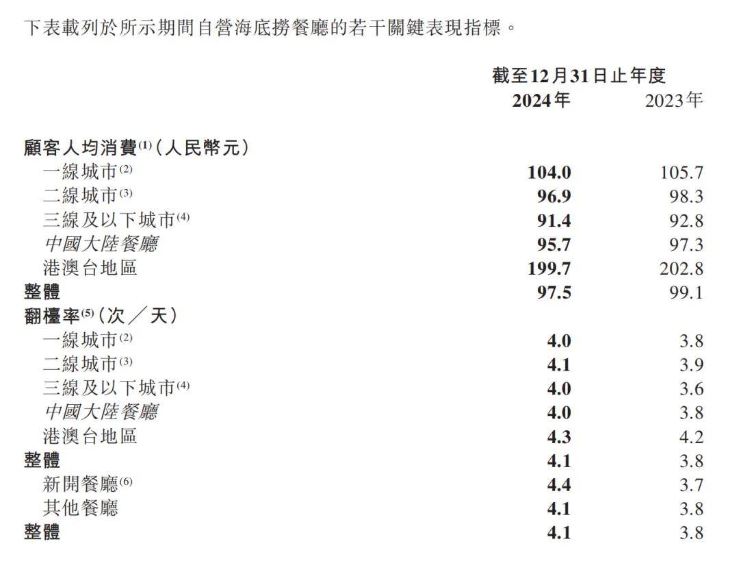 比如主品牌呷哺呷哺的翻台率在2024年为2.5次/天,而2023年的同期翻台率为2.6次/天。湊湊餐厅的经营指标也在下降,翻台率由上一年同期的2.0次/天降至2024年的1.6次/天。