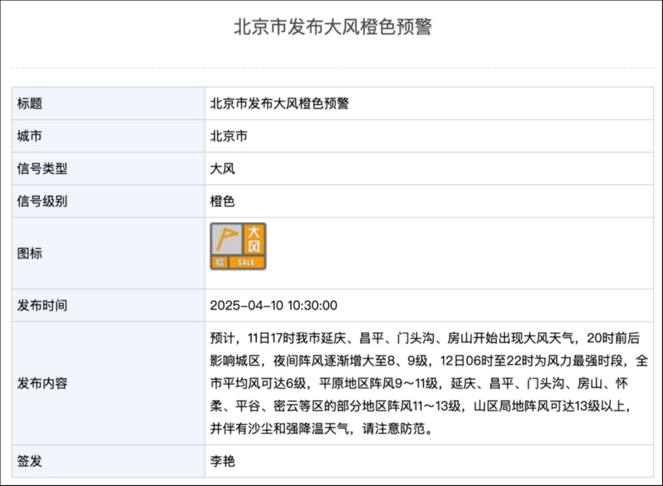 4月10日10时30分,北京市气象台发布大风橙色预警信号。