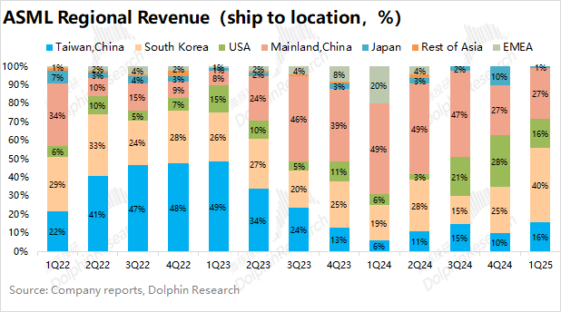 阿斯麦ASML本季度收入主要来自于韩国、中国大陆、中国台湾和美国,四者的合计收入占比达到99%。其中受韩国存储等需求提升的影响,本季度韩国地区收入占比达到40%。