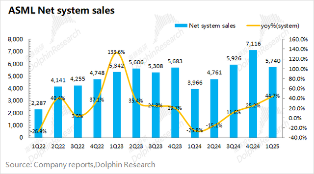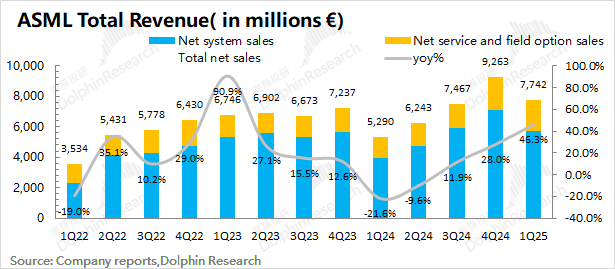 阿斯麦(ASML)的系统销售收入在2025年第一季度实现57.4亿欧元,同比增长44.7%。系统销售业务的同比增长,主要是EUV和DUV系列产品的带动。而环比层面,本季度系统销售收入有所回落,主要是受季节性因素影响,除EUV外,其余各产品收入均有所回落。