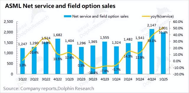 阿斯麦(ASML)的服务收入在2025年第一季度实现20亿欧元,同比增长51.1%。阿斯麦的服务收入,主要包括设备维护等项目,受行业周期影响较小。随着公司设备出货数量的增加,公司服务收入的增速也有所加快,当前公司的服务收入已经维持在20亿欧元左右。
