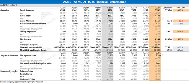 阿斯麦(ASML)于北京时间2025年4月16日下午的美股盘前发布了2025年第一季度财报(截止2025年3月),要点如下: