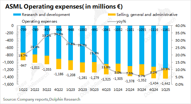 1.3经营费用端:阿斯麦(ASML)在2025年第一季度经营费用为14.42亿欧元,同比增长10.5%。