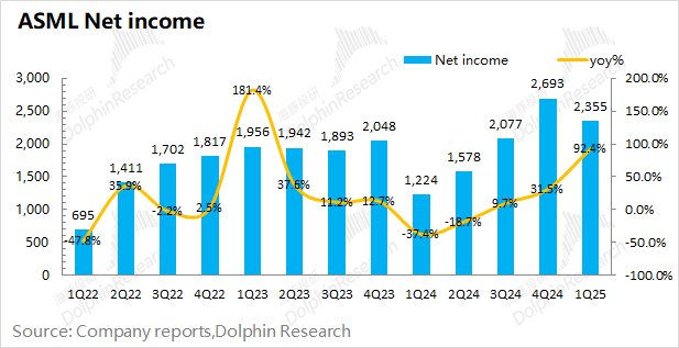 1.4净利润端:阿斯麦(ASML)在2025年第一季度净利润为23.55亿欧元,同比增长92.4%。虽然公司本季度收入端受季节性因素的影响,但公司本季度利润端同比仍有明显增长,主要得益于公司本季度毛利率达到了超预期的54%。