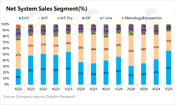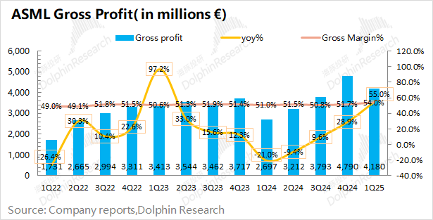 1.2毛利及毛利率:阿斯麦(ASML)在2025年第一季度实现毛利41.8亿欧元,同比增长55%。具体毛利率方面,公司本季度毛利率54%,继续回升,超公司指引上限(52-53%),主要是受服务收入及EUV占比提升的结构性影响。