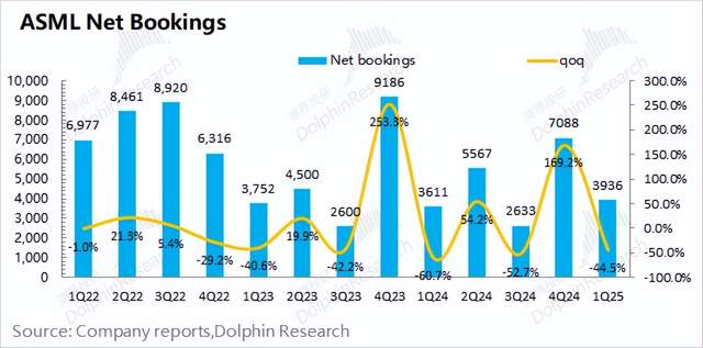 此前市场本身就对公司有所担心:1)半导体终端市场的回暖有所乏力;2)英特尔、三星等都大幅削减了2025年的资本开支预期。而公司一季度的净新增订单环比下滑44%,至39.4亿欧元(低于调整后的买方预期40.6亿欧元)。对于阿斯麦ASML,从本次给出的指引和订单情况看,并没看到需求明显好转的迹象,这将进一步降低市场对公司的预期。