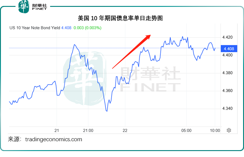美国国债收益率继续攀升,意味着投资者需要更高的利率溢价来弥补风险,见下图,美国10年期国债息率从4.34%大幅攀升至4.41%水平,与利率走势相逆的美债价格下挫。