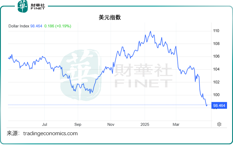 资金逃离美国资产,美元指数继续探底,周一跌至98.2水平,现仍未返回98.5点,见下图。