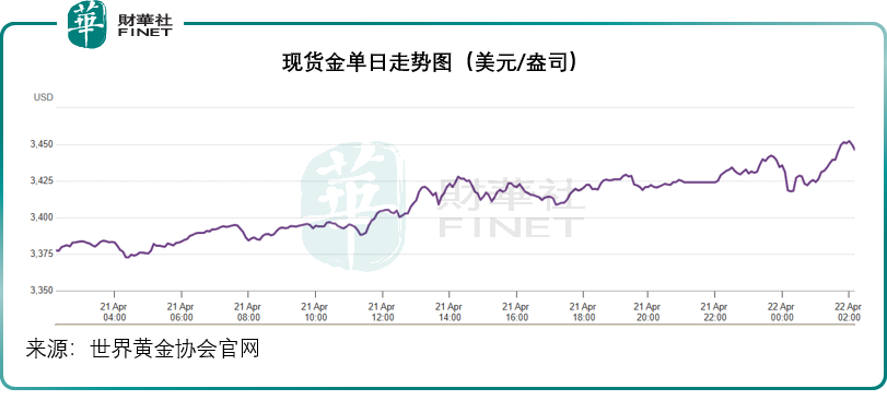 资金出走美国资产,冲入金市避险,叠加美元汇价下跌,黄金价格继续创新高,当前现货金报每盎司3,446.29美元,见下图,虽较午后创出的新高3500美元有所回落,但仍是极高的水平。