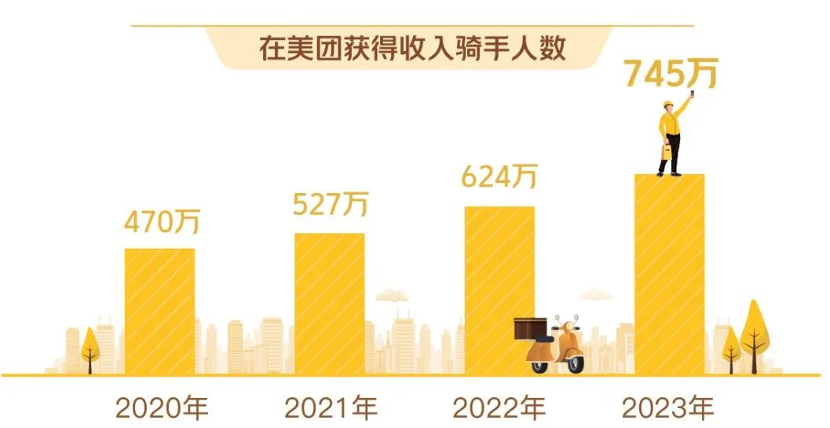 根据美团研究院《2023年·美团骑手权益保障社会责任报告》数据,在美团获得收入的骑手人数在2020年时为470万人,到2023年已经增长至745万人。