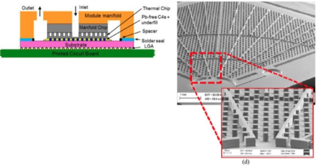 除了浸入式冷却技术,IBM使用的是嵌入式微通道相变冷却技术。IBM 将介电液直接泵入任意级别芯片堆叠的约 100μm 的微观间隙中,通过介电液从液相沸腾到气相来带走芯片的热量。他们对用此改造后的 IBM Power 7+ 芯片进行测试,结果表明结温降低了 25℃。
