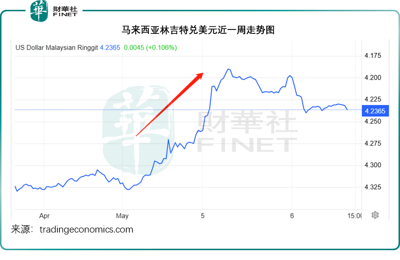 见下图,马来西亚林吉特兑美元大涨。